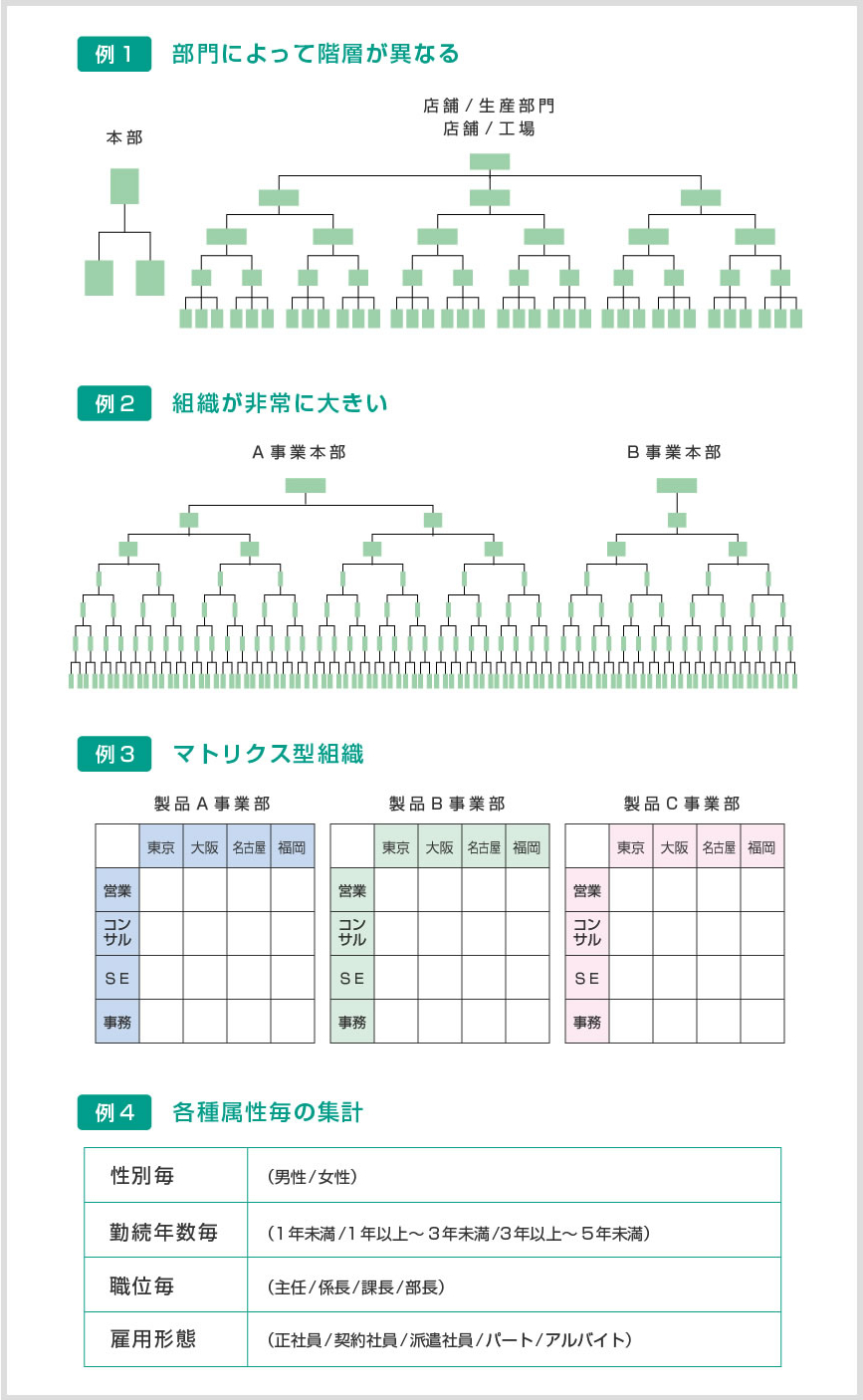 複雑な組織体系や特定の属性毎の集計にも柔軟に対応